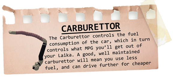 Upgrade, maintain and care for your Laika 601 Deluxe motor vehicle. Keep close attention to everything from the state of your tyres, the condition of your engine and even the space in your trunk. Repair each aspect of your scrappy little car and install unique upgrades to deal with the changing world. Everything from cargo weight to the condition of your carburettor will determine how your car performs on the open road.