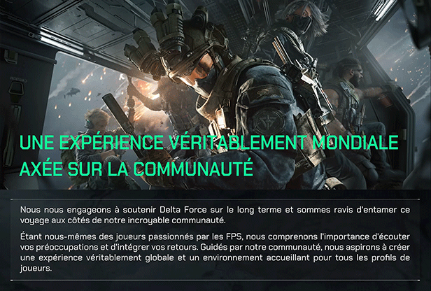 Delta Force est le premier FPS auquel j'ai joué, et il a éveillé ma passion pour ce genre. Je suis très reconnaissant d'avoir eu l'opportunité de créer Delta Force, et mon objectif est de partager ma joie avec la communauté. J'espère que ce nouveau Delta Force deviendra le FPS tactique dont je rêve depuis longtemps.
