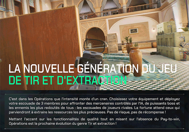 - Opérations : déployez-vous derrière les lignes ennemies avec votre escouade. Cherchez des objets précieux, affrontez des joueurs rivaux et extrayez-vous avant qu’il ne soit trop tard. Le mode Raid JcE offre des missions plus dures, basées sur des objectifs, il mettra votre escouade à l’épreuve.