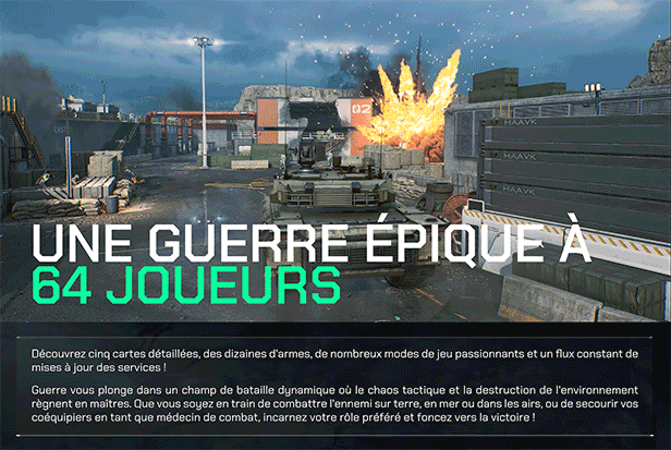 - Guerre : affrontezl’ennemi sur terre, en mer et dans les airs dans des combats JcJ à 32 contre 32, avec de nombreux véhicules et de l'équipement tactique unique.