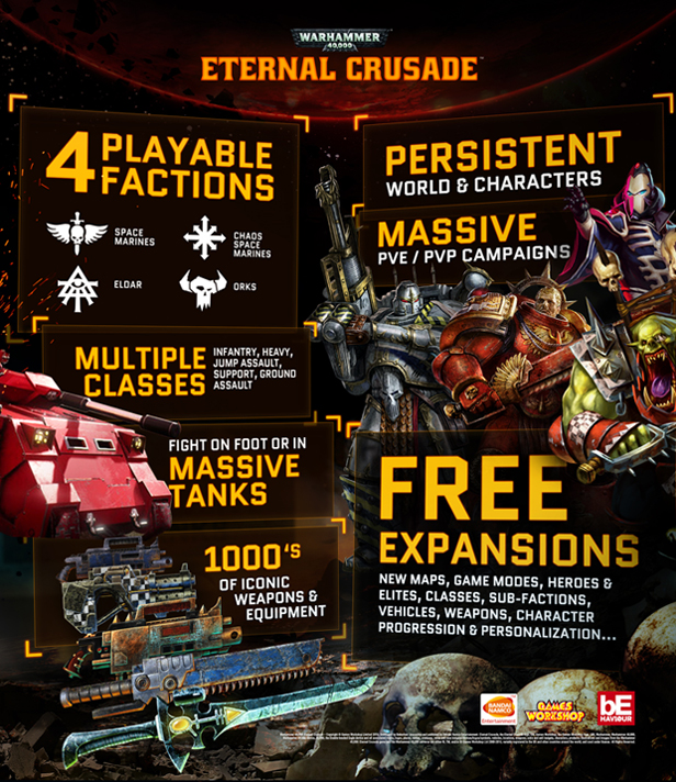 Prenez part à des campagnes militaires massives opposant 4 factions pour la conquête d'un monde persistant. Plongez dans les fronts mouvants et écrasez vos adversaires ! Foncez dans la mêlée, bondissez en l'air avec un jump pack ou tirez dans le tas depuis l'une des tourelles d'un char Predator armé jusqu'aux dents. Les combats d'Eternal Crusade vont de l'affrontement individuel aux coups d'épées tronçonneuses à des batailles rangées épiques.