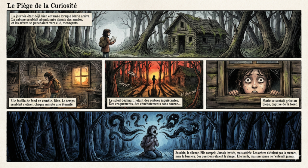 Soudain, le silence se fit. Les bruits étranges cessèrent, les ombres disparurent. Marie regarda autour d’elle, intriguée. C’est alors qu’elle comprit qu’elle avait été piégée. Elle n’avait jamais été invitée à la cabane, mais attirée dans ce piège diabolique. Les arbres qui semblaient la menacer étaient en fait là pour la protéger. Elle avait été la proie de sa curiosité. Marie comprit trop tard que ses questions les plus profondes étaient dangereuses, qu’elles auraient dû rester enfouies en elle. Elle hurla, mais personne ne l’entendit jamais.