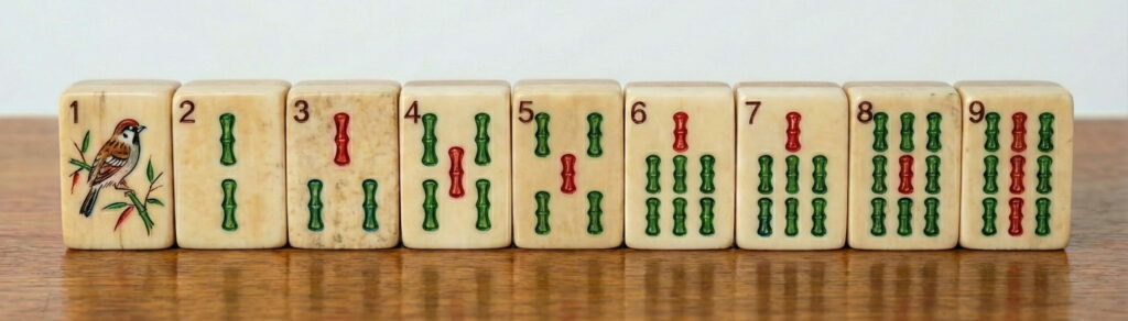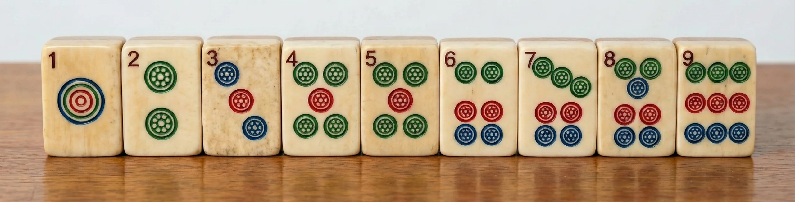 Les tuiles avec des ronds. Facile, non ? Un rond = 1, deux ronds = 2. Mais que représentent-ils ? Des pizzas ? Des balles ? Historiquement, ce sont des pièces de monnaie (des sapèques en cuivre). Le « 1 de Cercle » est une énorme pièce, et les autres sont des groupements de petites pièces. C’est la monnaie de base du jeu.