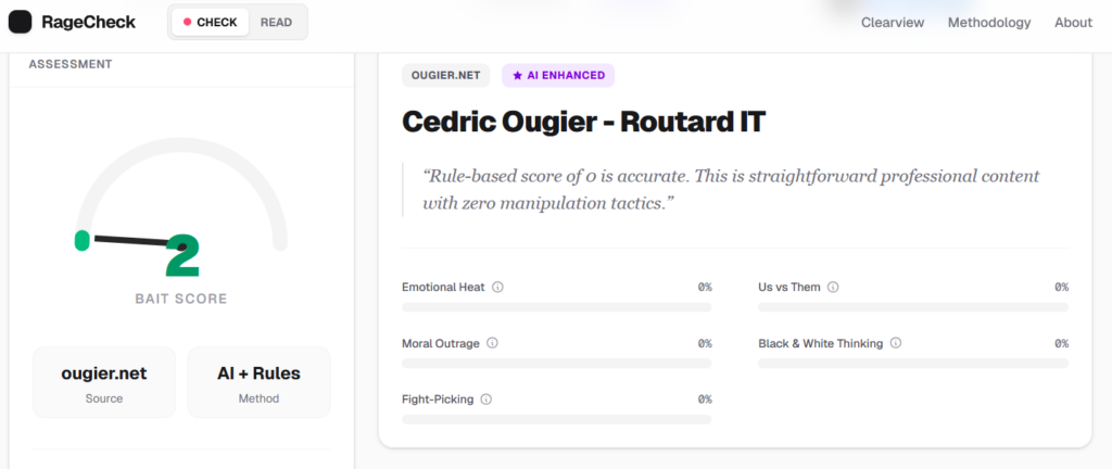Dans ce nouvel article du Routard IT, on décrypte cette mécanique toxique qui a proliféré ces dernières années, qui envahi nos fils d’actualité et on découvre un outil, RageCheck, qui pourrait bien être le compteur Geiger de notre santé mentale numérique.